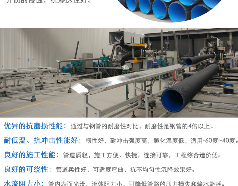⑦、良好的可繞性:管道柔性好,可適度彎曲,抗不均勻沉降效果好。